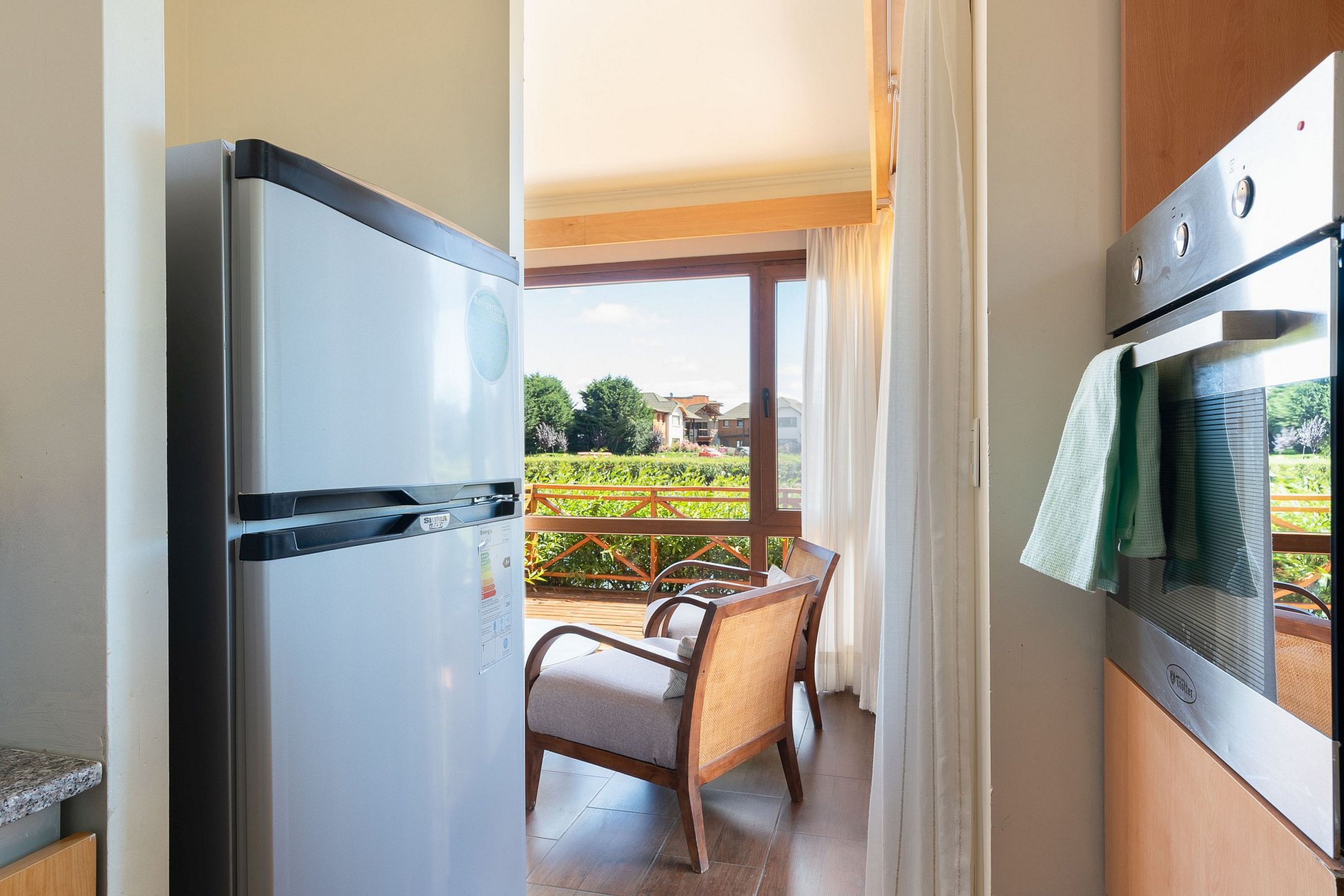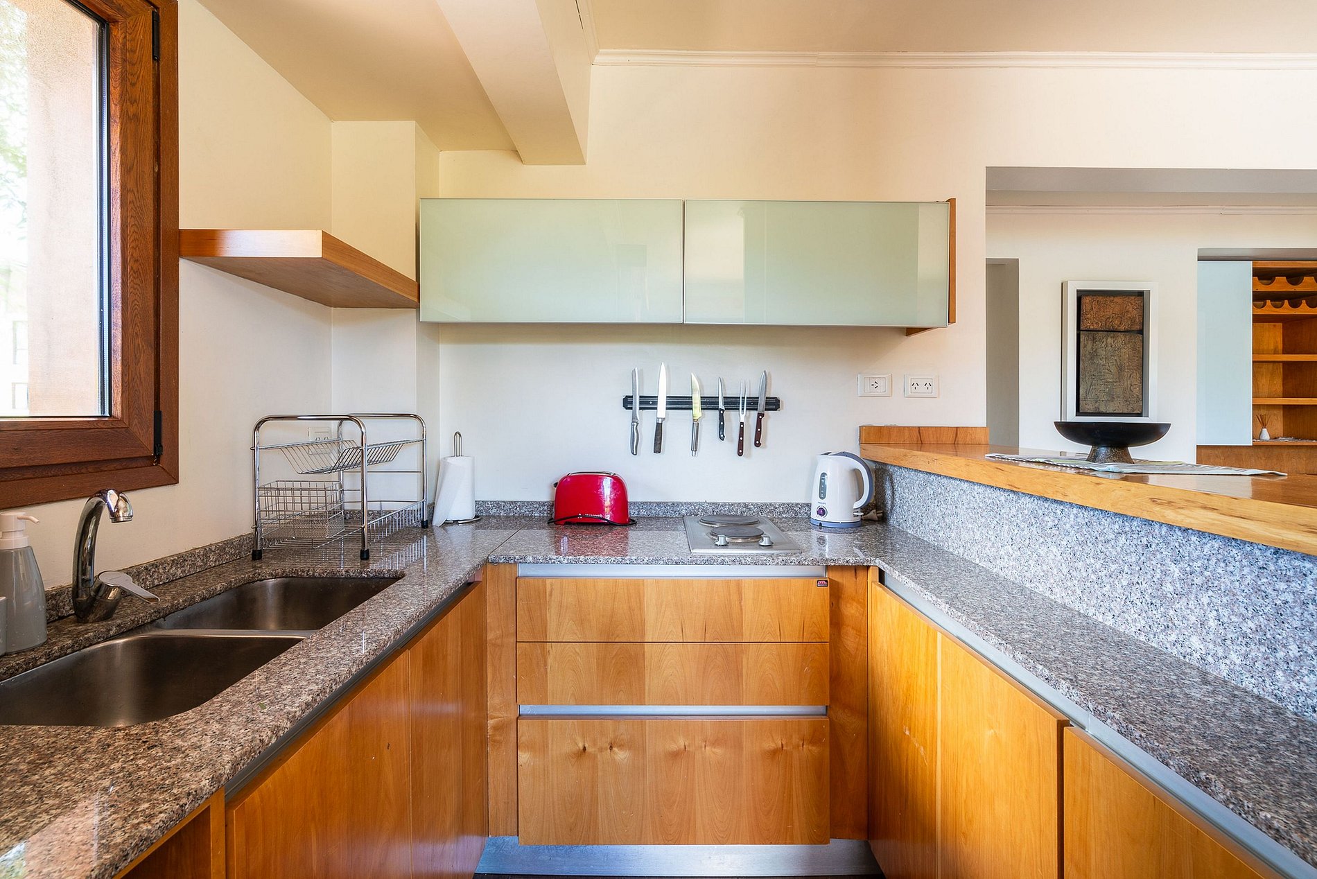 It has a large refrigerator, electric oven, coffee maker, kettle, toaster and electric grill for outdoor terrace.