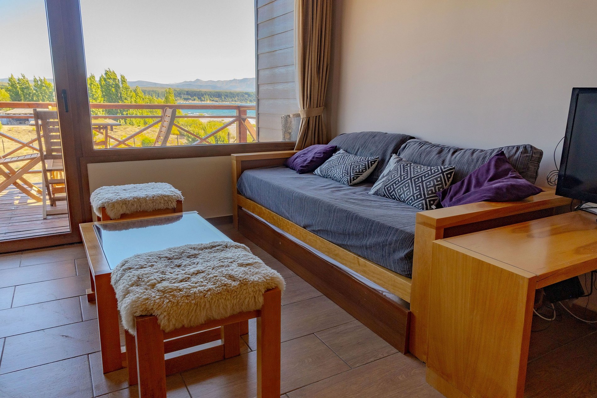 2 room apartment for 4 people on the second floor overlooking the Nahuel Huapi Lake, Bariloche, and the mountains. It has a bedroom with a double bed, and a double sofa bed in the living room (bed + trolley bed).