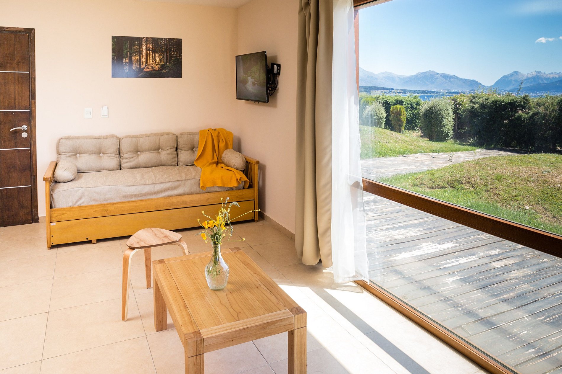 Departamento de 2 ambientes frente al Lago Nahuel Huapi (planta baja) con vista a Bariloche y montañas. Capacidad 5 personas: habitación con cama matrimonial, sofá cama doble (cama + carrito) y sillón cama para niño hasta 12 años (máx. 90 kg, 65×190×18 cm). Equipado con heladera bajo mesada, anafe, horno eléctrico, tostadora, pava, cafetera, TV en living y Smart TV en habitación.