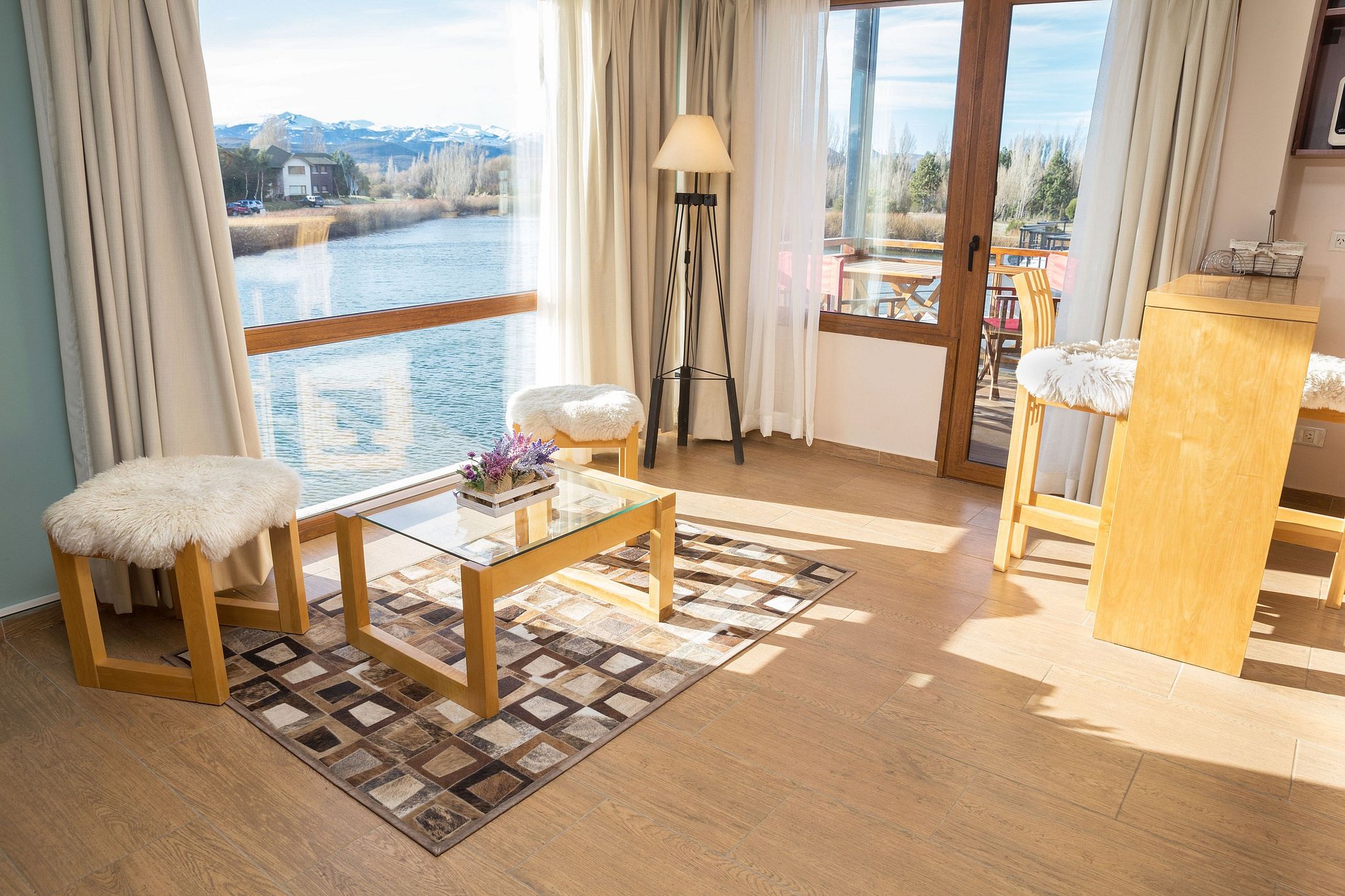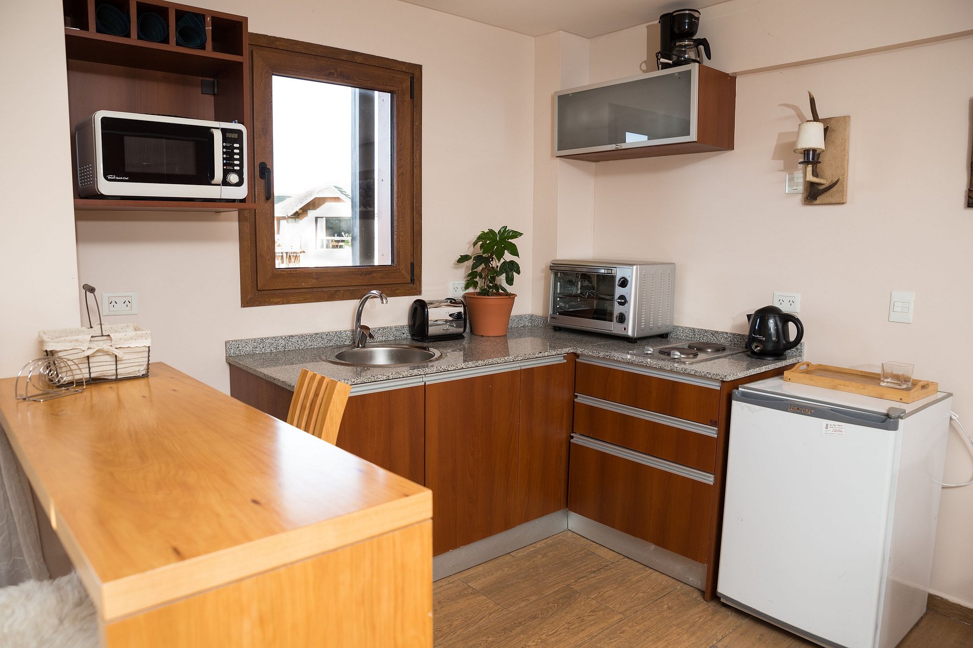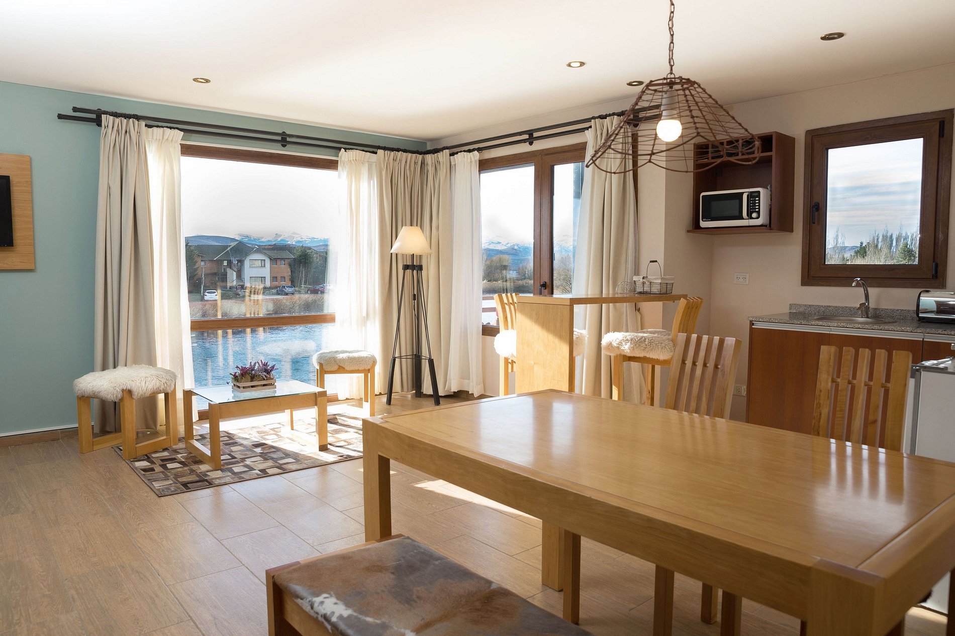 Exclusivo departamento de 2 ambientes para 5 personas en primer piso, frente a la laguna, con vista panorámica a la laguna, Lago Nahuel Huapi, Bariloche y montañas. Cuenta con habitación con cama matrimonial y sillón cama de espuma para niño hasta 12 años (máx. 90 kg, 65×190×18 cm). Equipado con heladera grande, anafe y horno eléctrico, parrilla eléctrica exterior, tostadora, cafetera, microondas y secador de pelo.