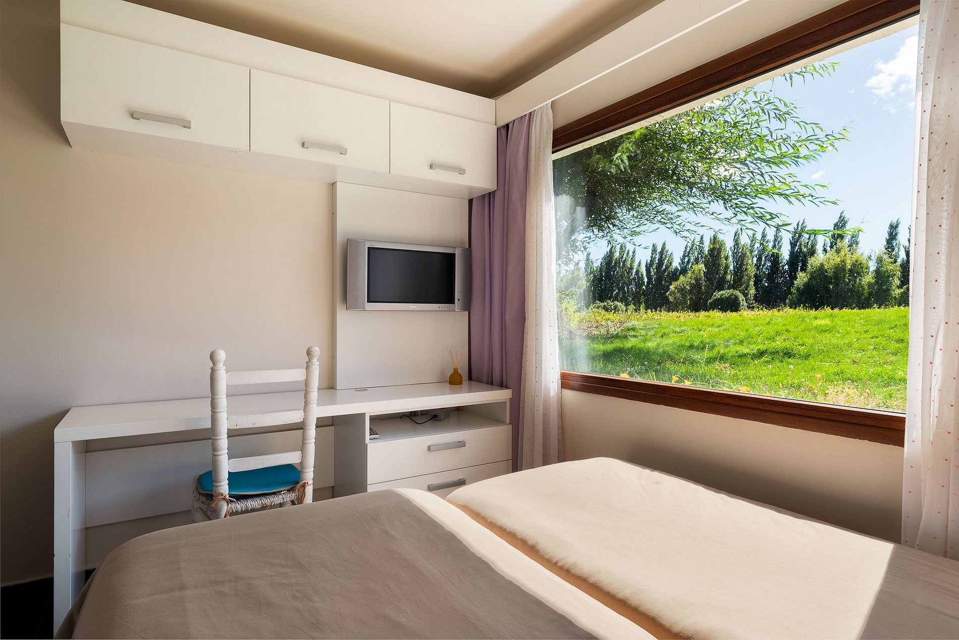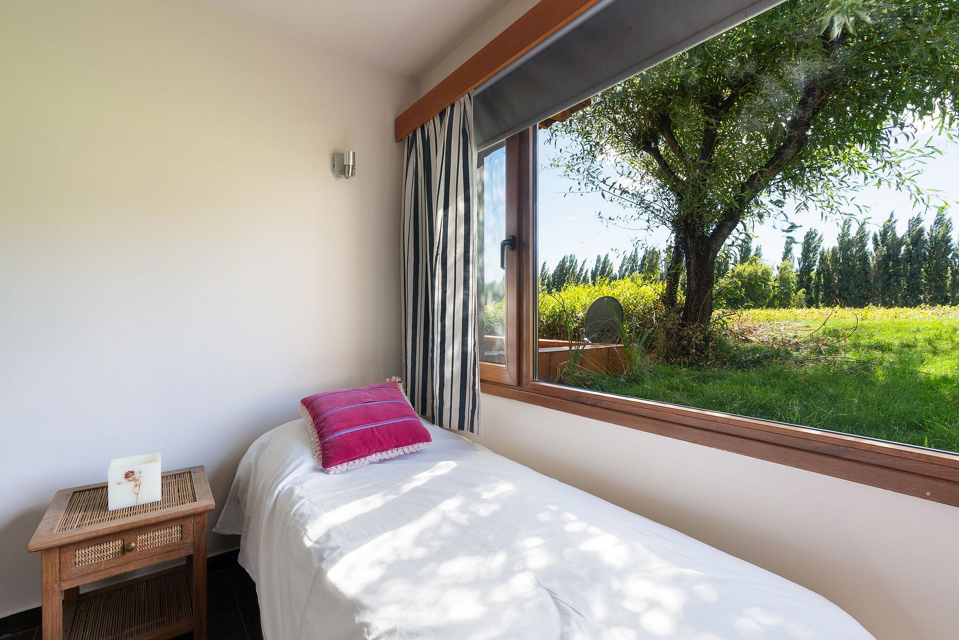 Departamento de 3 habitaciones y 2 baños para 5 personas en Planta Baja frente a la Laguna. Tiene una habitación con cama matrimonial, otra habitación con 2 camas individuales y la tercera habitación con una cama individual.