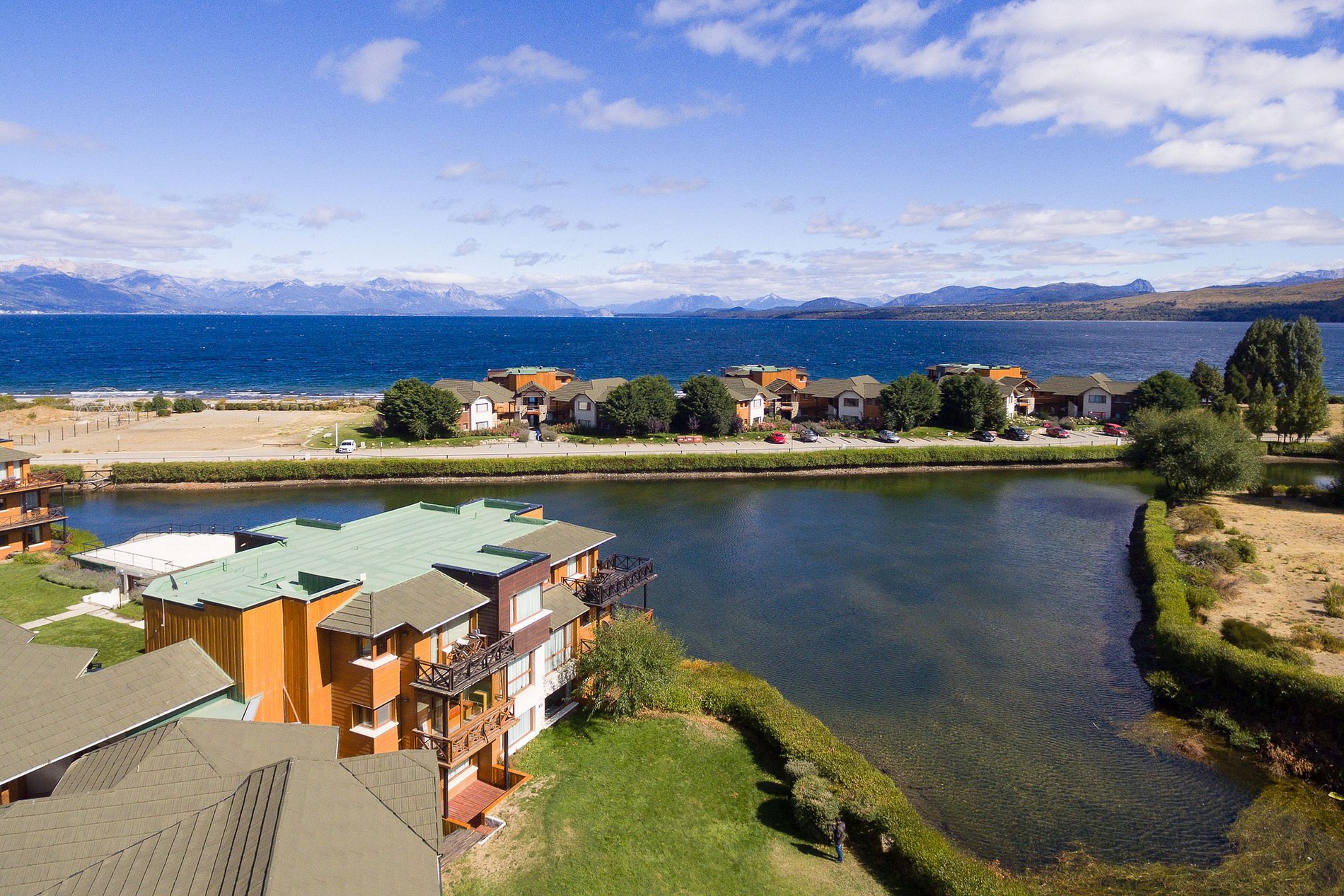 El Resort se encuentra localizado a orillas del Lago Nahuel Huapi, en la localidad de Dina Huapi, Río Negro, a 14kms del centro de Bariloche. Nuestros departamentos ofrecen una inmejorable vista. El Complejo tiene 300 metros de playa sobre el lago, y una hermosa laguna patos y peces y con una hermosa pileta habilitada sólo en verano.