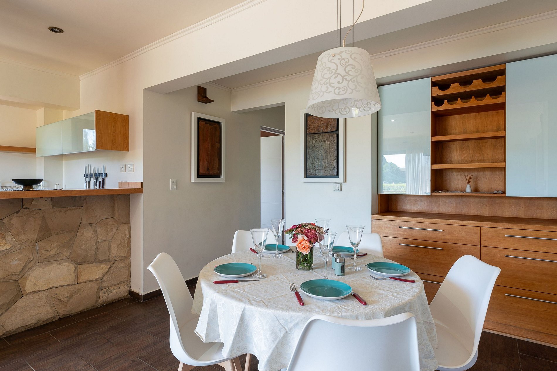Cuenta con heladera grande, horno eléctrico, cafetera, pava, tostadora y parrilla eléctrica para terraza exterior.