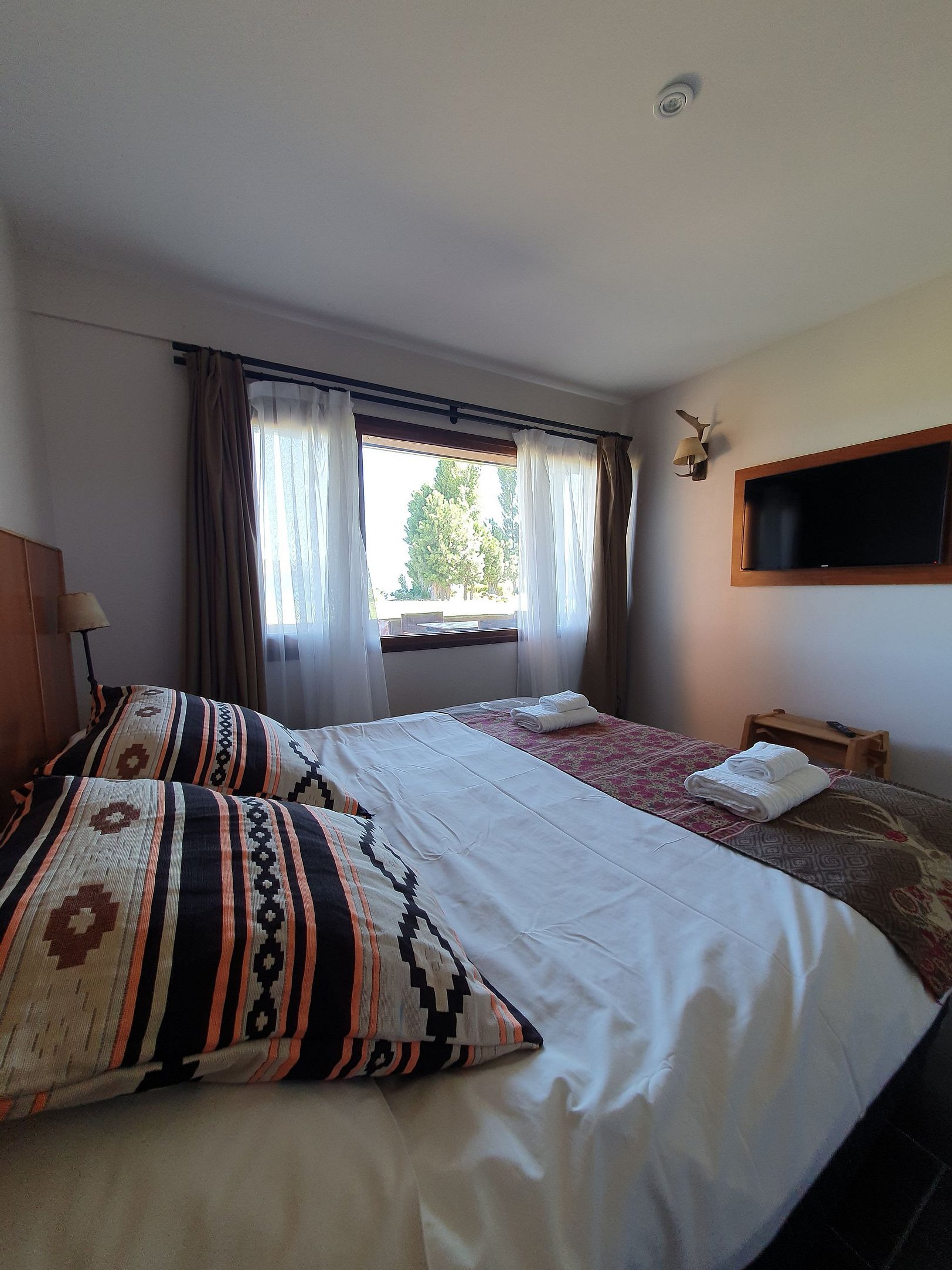 Departamento de 2 ambientes para 4 personas en Planta Baja vista al Lago Nahuel Huapi y a las montañas. Tiene una habitación con cama matrimonial, y un sofá cama doble en el living (cama + cama carrito)