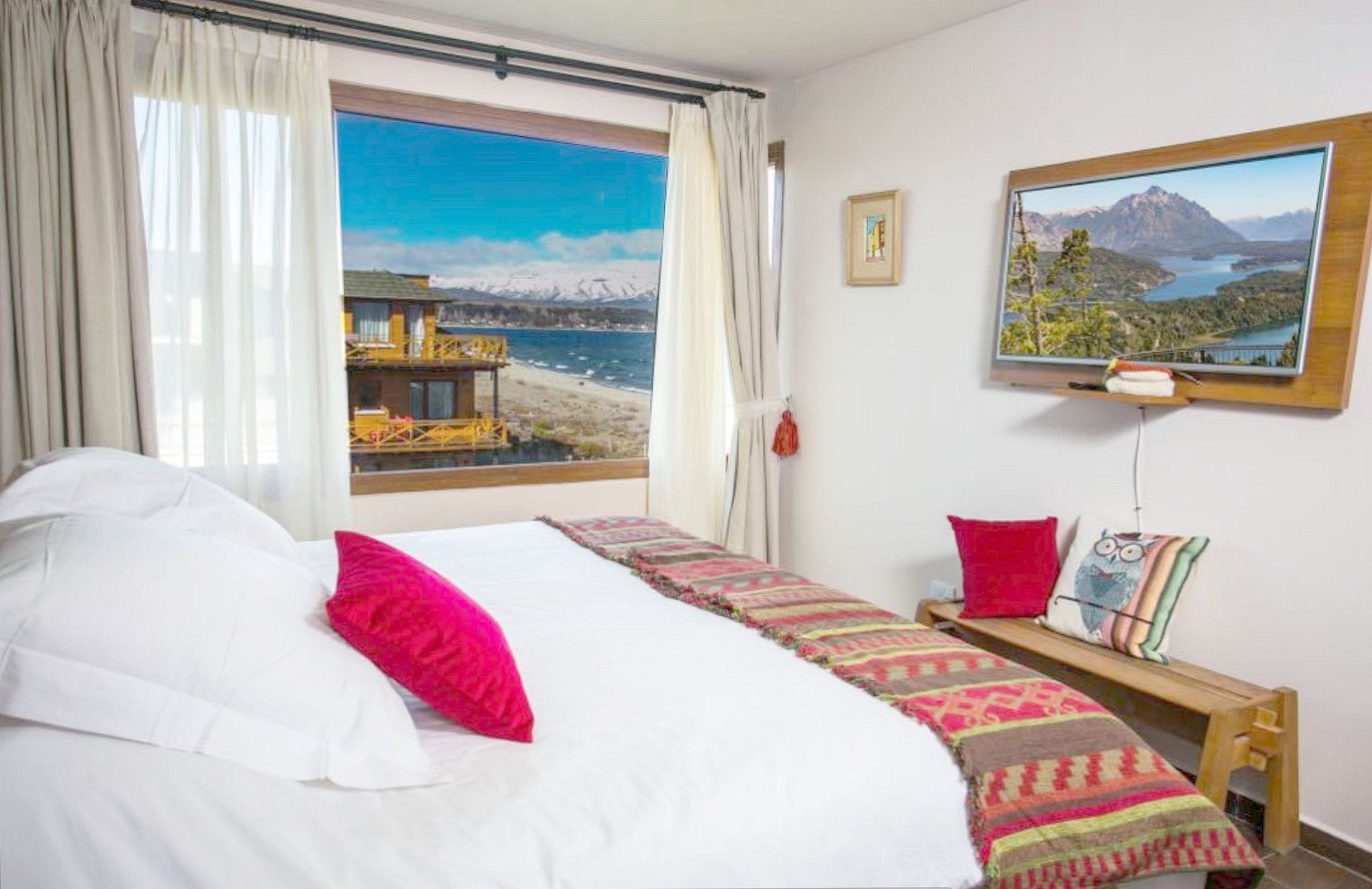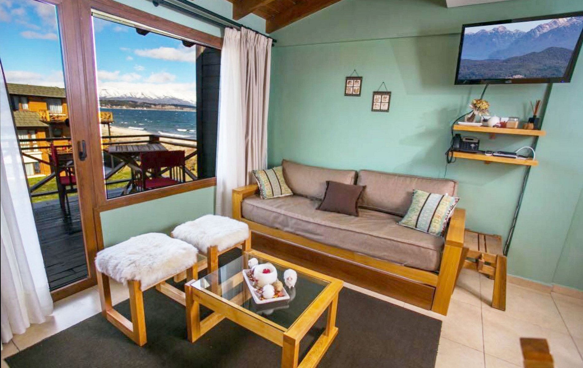 Departamento de 2 ambientes para 4 personas en segundo piso vista al Lago Nahuel Huapi, a Bariloche, y a las montañas. Tiene una habitación con cama matrimonial, y un sofá cama doble en el living (cama + cama carrito).