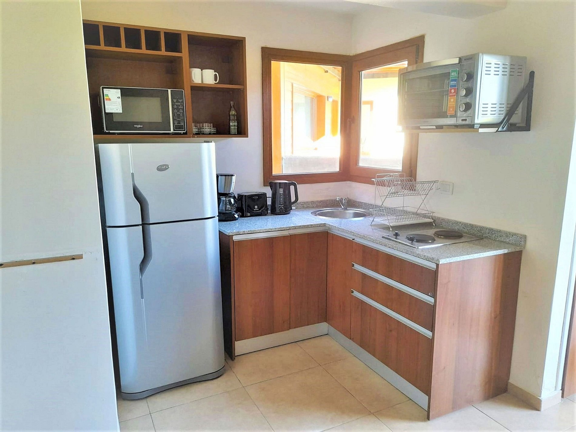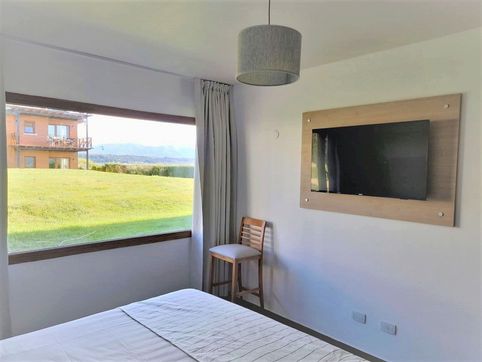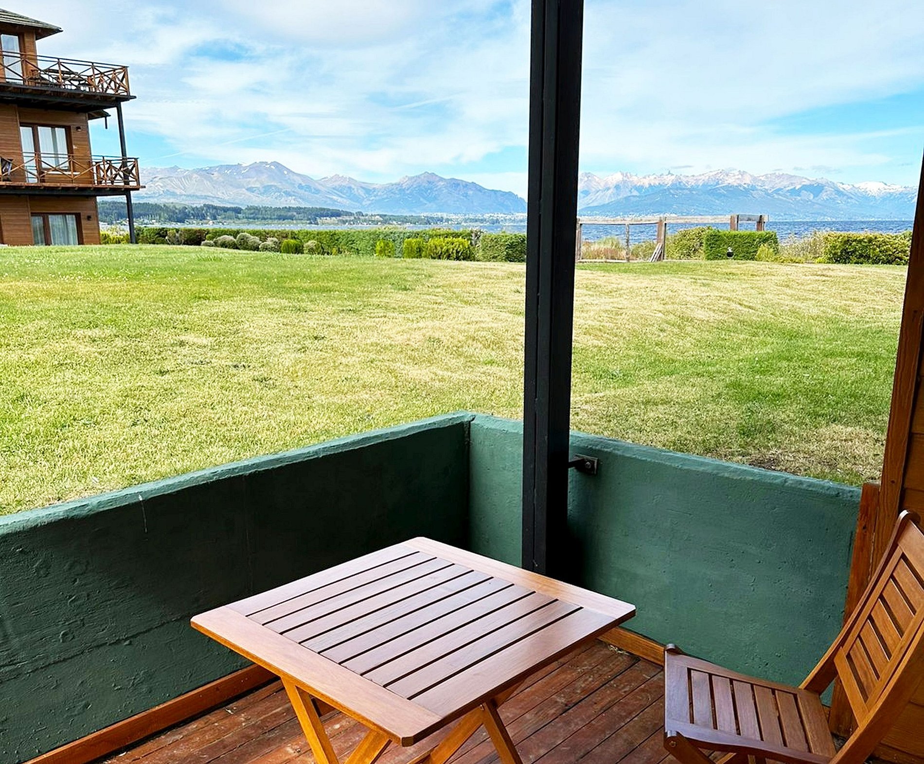 Departamento de 2 ambientes para 4 personas en Planta Baja vista al jardín y al Lago Nahuel Huapi. Tiene una habitación con cama matrimonial, y un sofá cama doble en el living (cama + cama carrito). El departamento se encuentra muy bien equipado, con anafe eléctrico, horno eléctrico, tostadora, cafetera, microondas, heladera grande y secador de pelo