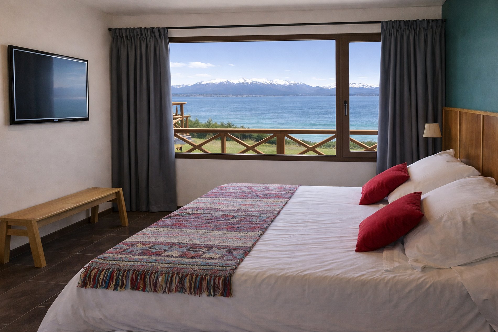 Departamento de 2 ambientes para 5 personas en Primer Piso vista al Lago Nahuel Huapi, a Bariloche, y a las montañas. Tiene una habitación con cama matrimonial, un sofá cama doble en el living (cama + cama carrito).