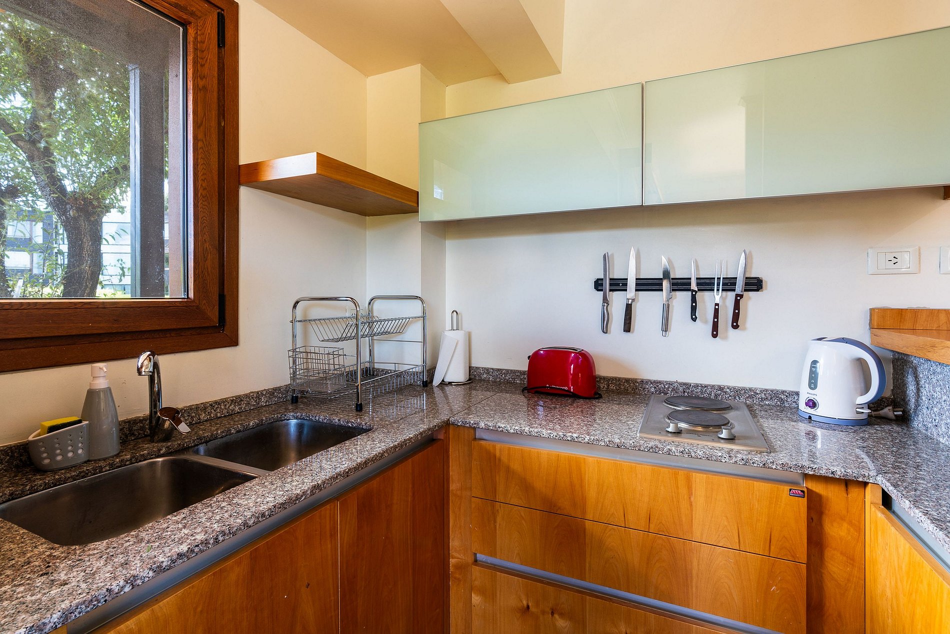 Tem uma geladeira grande, forno elétrico, cafeteira, chaleira, torradeira e churrasqueira elétrica para o terraço externo.