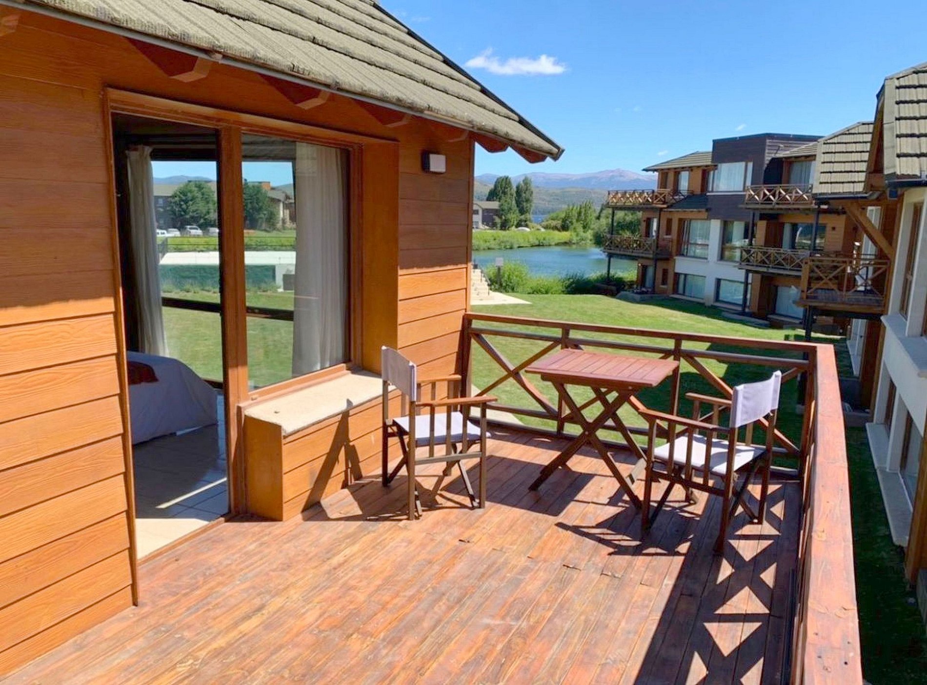 O resort está localizado em Dina Huapi, a 5' de supermercados e restaurantes e a 14 km (18') do centro de Bariloche. Temos 300 metros de praia no lago Nahuel Huapi, jardins e áreas verdes, e uma bela lagoa com piscina no verão (de meados de dezembro a meados de março), gratuita para nossos hóspedes.