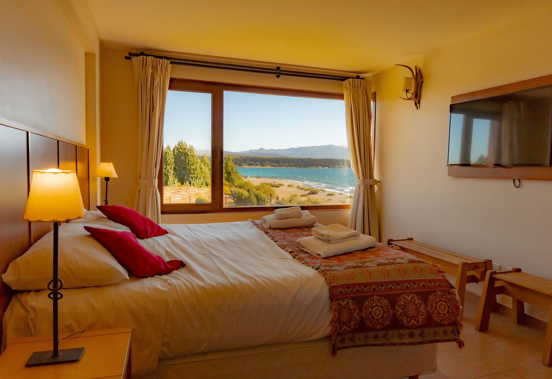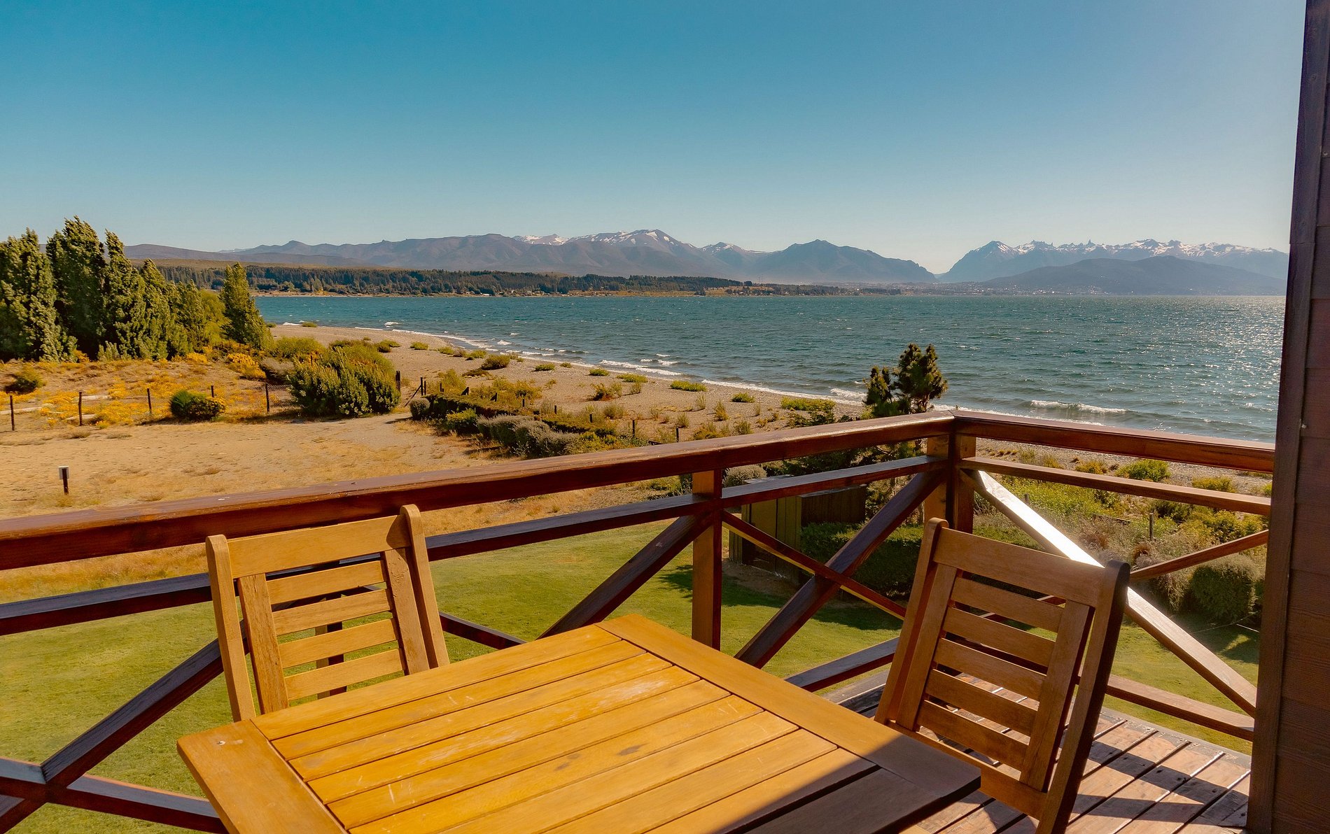 O resort está localizado em Dina Huapi, a 5' de supermercados e restaurantes e a 14 km (18') do centro de Bariloche. Temos 300 metros de praia no lago Nahuel Huapi, jardins e áreas verdes, e uma bela lagoa com piscina no verão (de meados de dezembro a meados de março), gratuita para nossos hóspedes.
