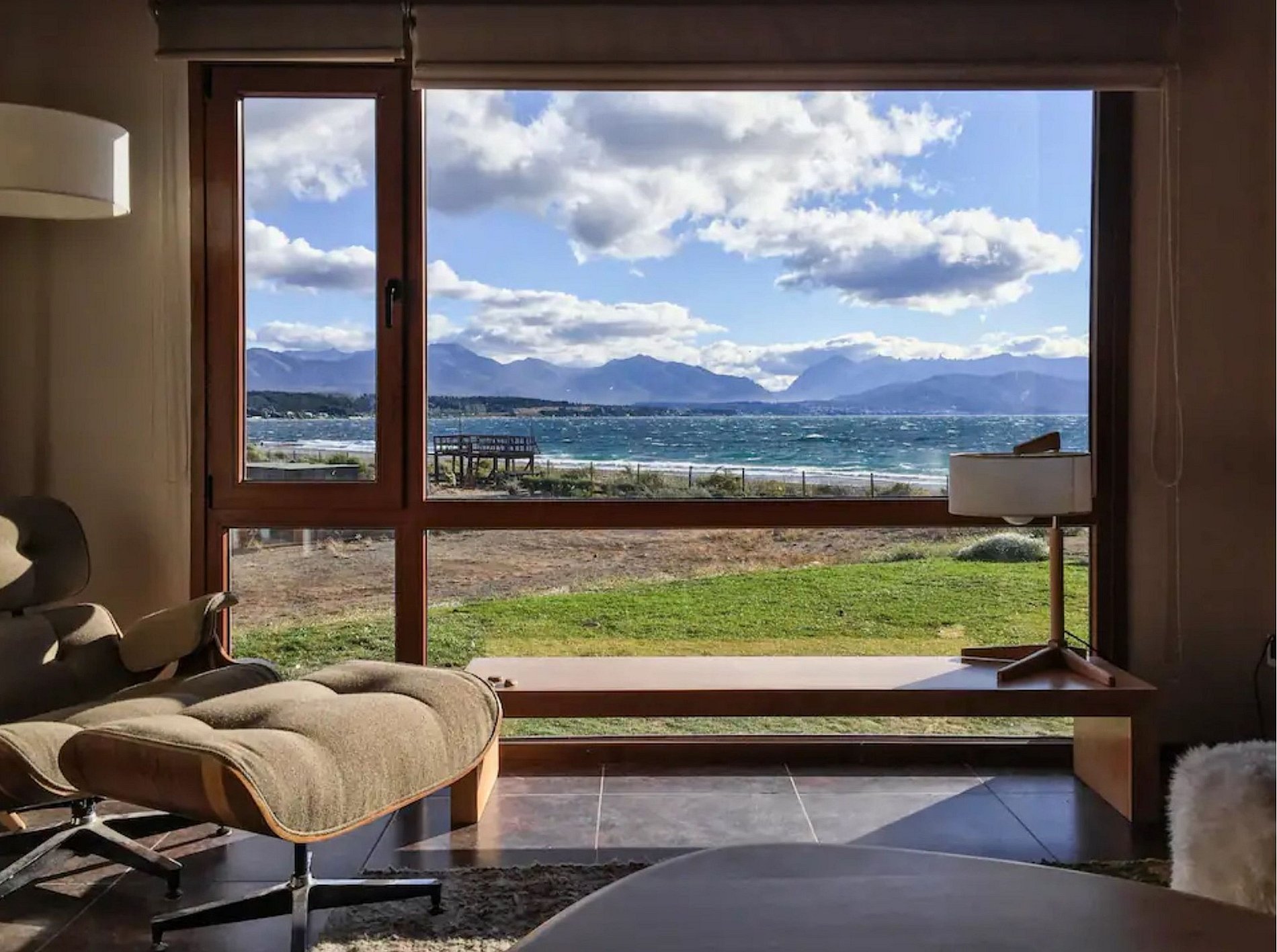 Exclusivo apartamento de 2 quartos e 2 banheiros para 5 pessoas no primeiro andar com vista para o Lago Nahuel Huapi, Bariloche e as montanhas. Tem um quarto com uma cama de casal, outro quarto com 2 camas de solteiro e um sofá-cama na sala de estar para a 5ª pessoa.