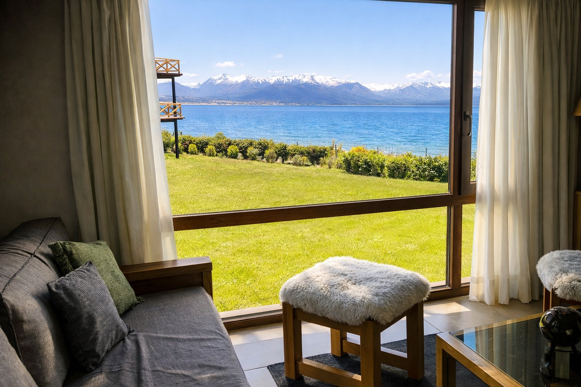 Apartamento de 2 cômodos para 5 pessoas no primeiro andar, com vista para o Lago Nahuel Huapi, Bariloche e as montanhas. Tem um quarto com uma cama de casal, e um sofá-cama de casal na sala (cama + carrinho).