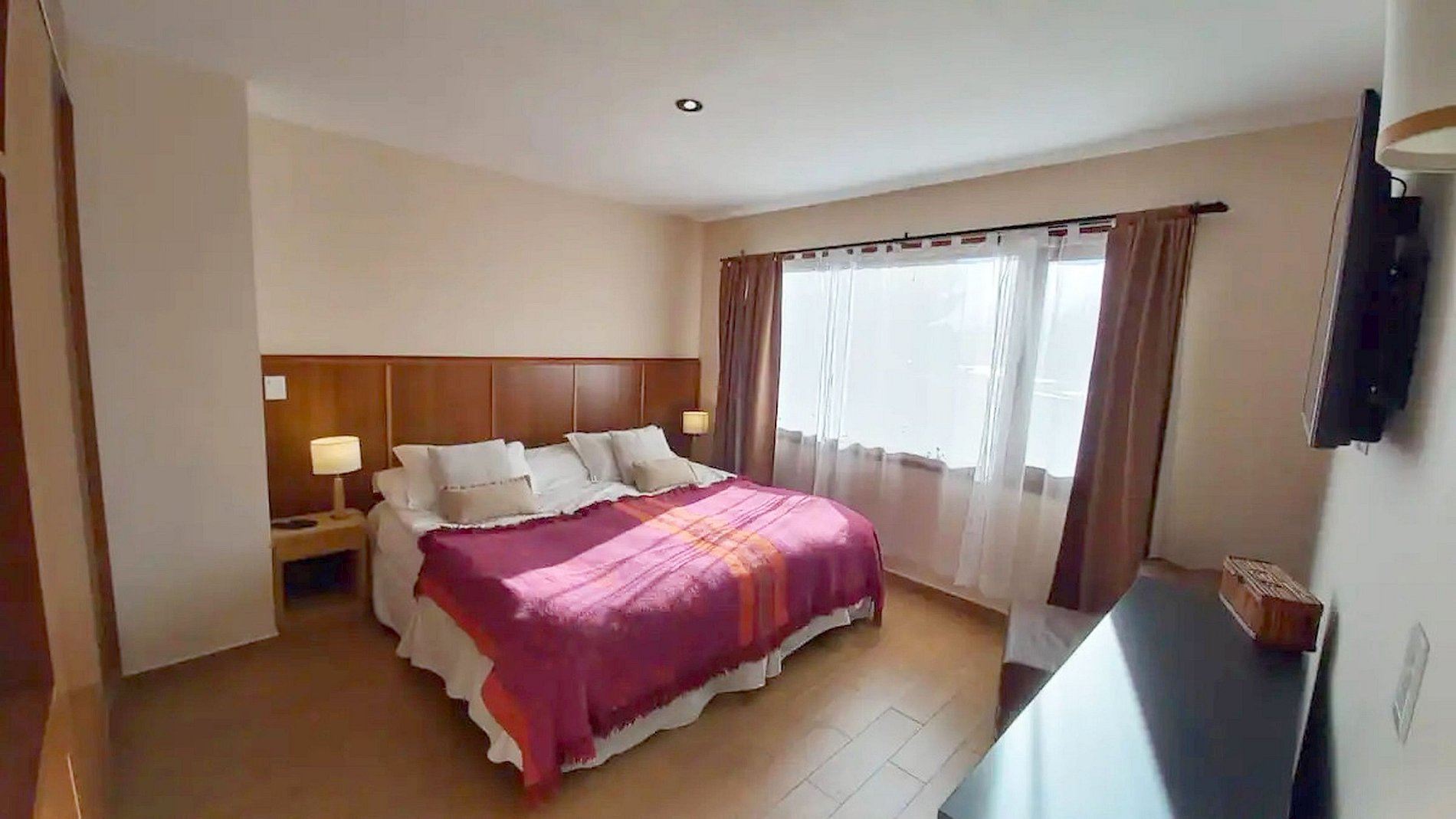 Apartamento de 2 cômodos para 5 pessoas no andar térreo com vista para o Lago Nahuel Huapi, Bariloche e as montanhas. Tem um quarto com cama de casal, 2 camas de solteiro na sala de estar e um futon de 65 cm de largura x 30 cm de altura para a 5ª pessoa (criança).