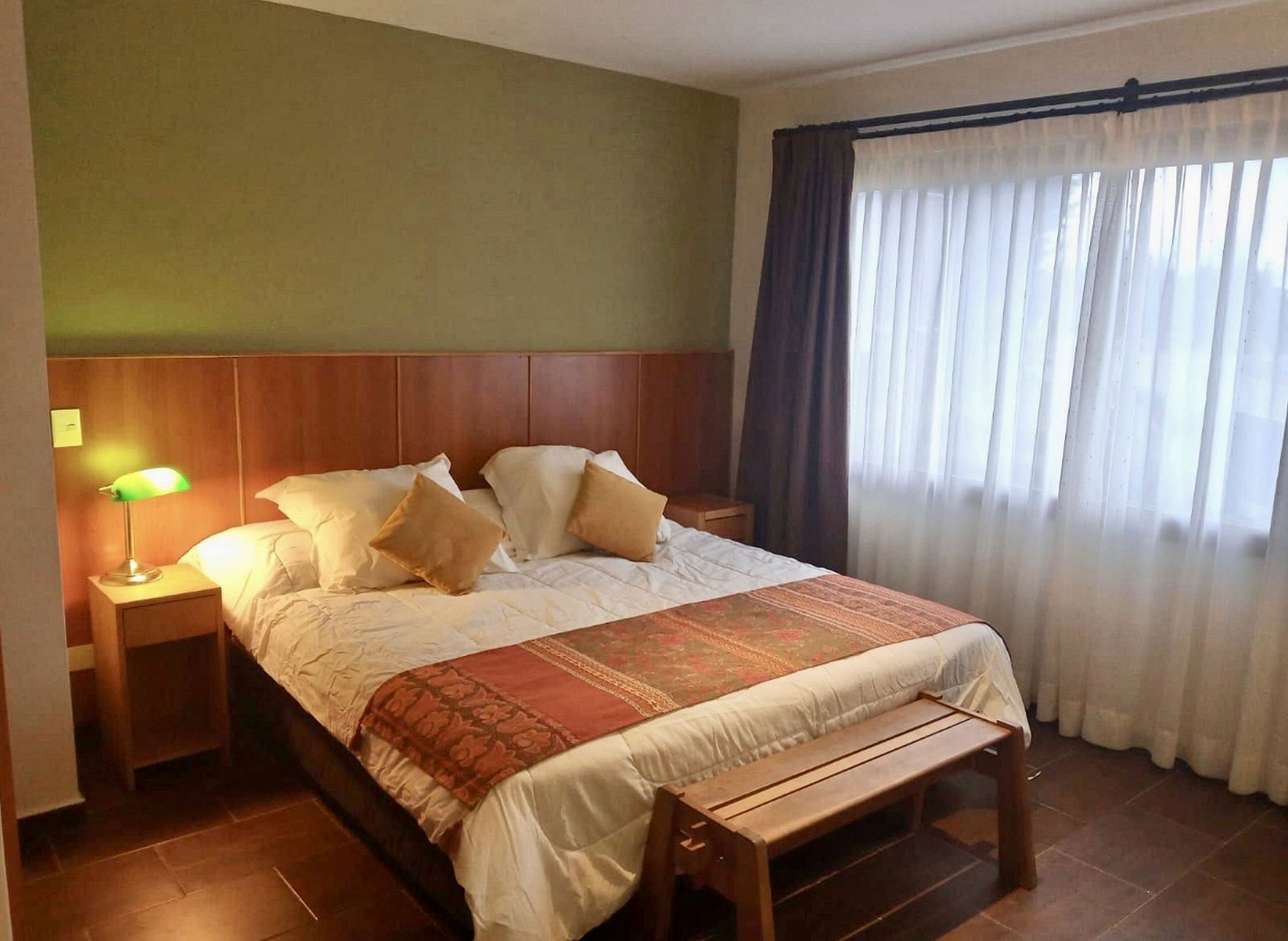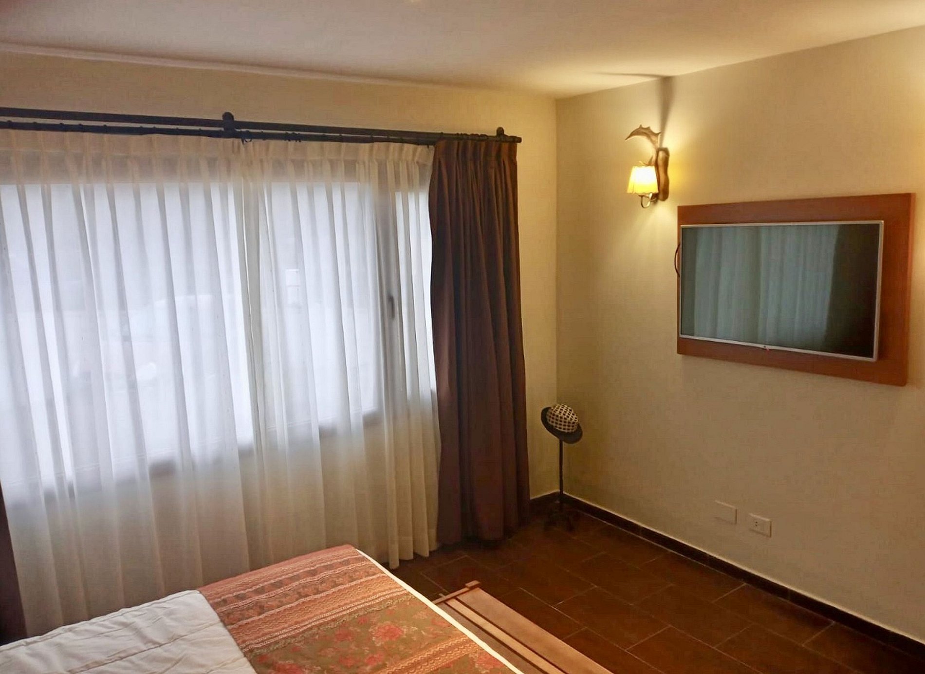 Apartamento de 2 cômodos para 4 pessoas no andar térreo, com vista para o Lago Nahuel Huapi, Bariloche e as montanhas. Tem um quarto com uma cama de casal e um sofá-cama para dois pessoas.